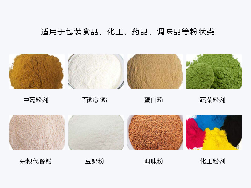 適用于包裝高精度的材料,如:咖啡粉、五谷雜糧粉、面粉、藥粉、香料粉末、淀粉、礦物粉等各種粉末填充包裝。